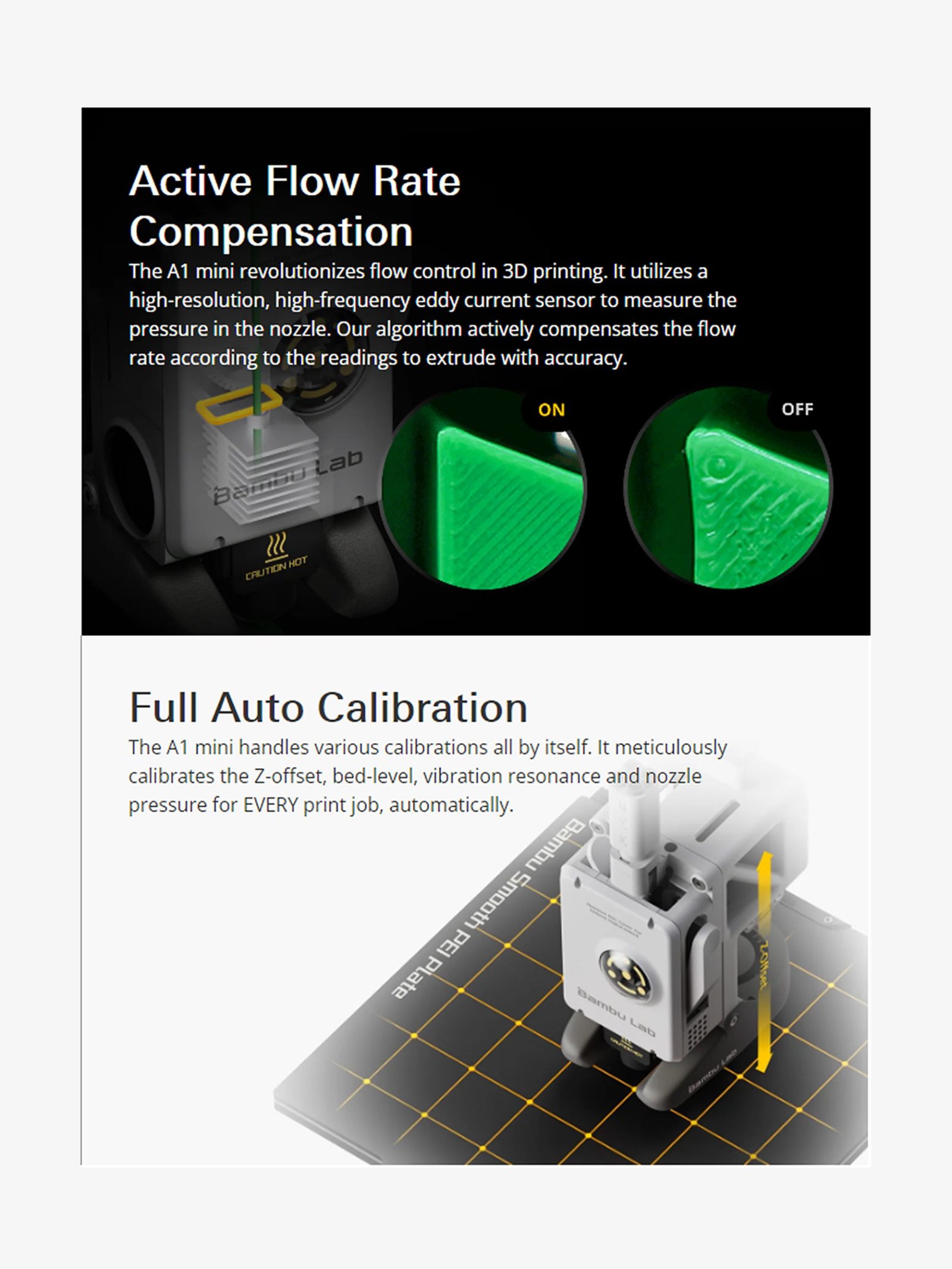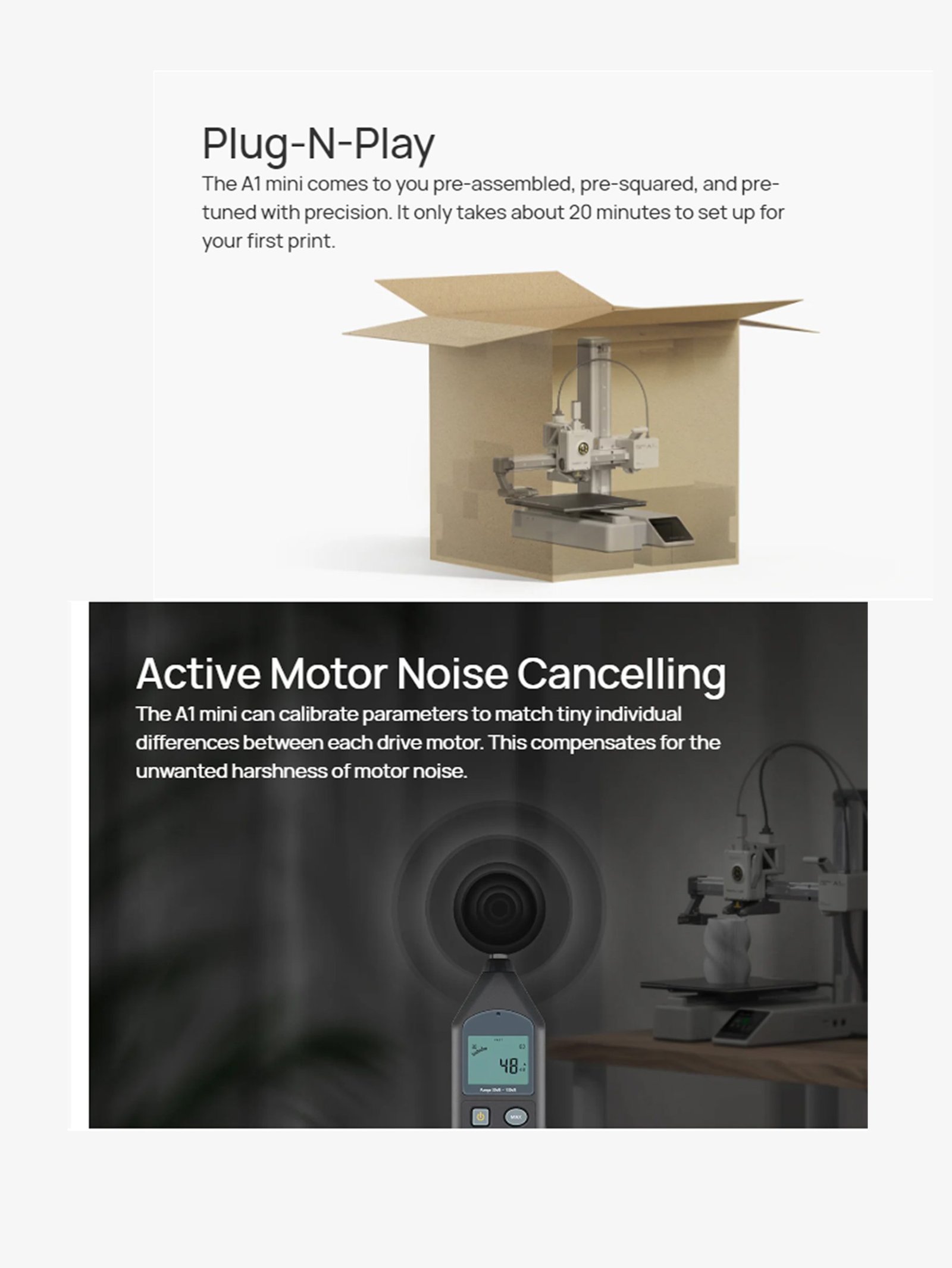 The Bambu Lab A1 Mini 3D Printer  Featuring a robust 3D printer frame , it ensures durability and stability for consistent, high-quality prints. Perfect for makers and professionals, this compact printer delivers reliable performance and vibrant multi-material results. Bambu Lab A1 Mini main Features Active Flow Rate Compensation – The A1 mini revolutionizes flow control in 3D printing. It utilizes a high-resolution, high-frequency eddy current sensor to measure the pressure in the nozzle. Our algorithm actively compensates the flow rate according to the readings to extrude with accuracy. Full Auto Calibration – The A1 mini handles various calibrations all by itself. It meticulously calibrates the Z-offset, bed-level, vibration resonance and nozzle pressure for EVERY print job, automatically. Plug-N-Play – The A1 mini comes to you pre-assembled, pre-squared, and pre-tuned with precision. It only takes about 20 minutes to set up for your first print. Active Motor Noise Cancelling – The A1 mini can calibrate parameters to match tiny individual differences between each drive motor. This compensates for the unwanted harshness of motor noise. Bed Slinger, with CoreXY Speed And Quality(High-Speed Precision)- Full-metal Rails, rigid frame, nozzle pressure sensor, accelerometers, powerful MCU, and above all, an advanced motion control system that utilizes these features to print a 14-minute benchy with quality and following all the speed benchy rules straight out of the box without using specialized filaments.