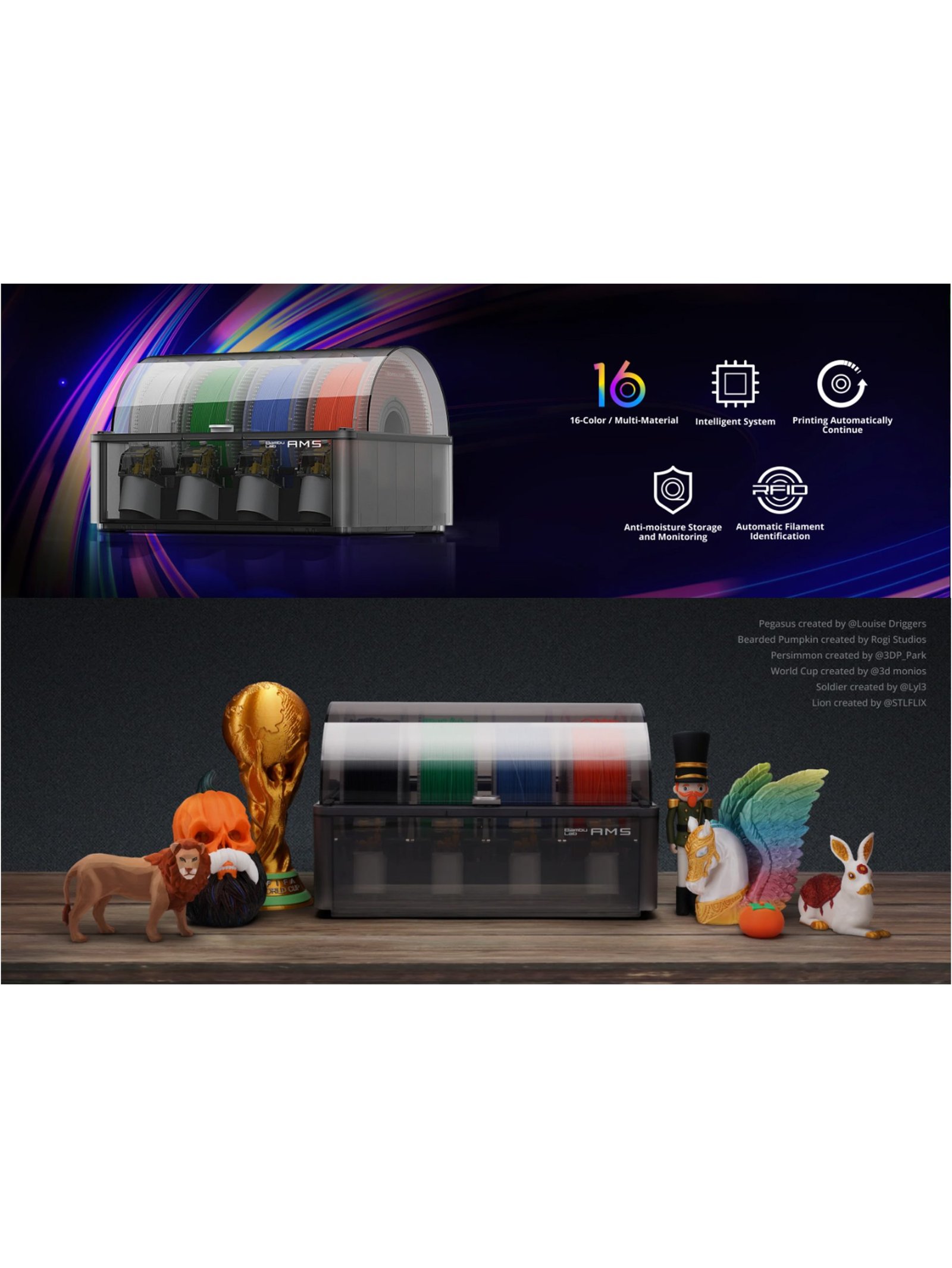 The Bambu Lab AMS is an advanced automatic material system for multi-color 3D printing . With tangle detection , it ensures smooth prints and easy filament swaps, supporting 4-color and 16-color 3D printing . This energy-efficient 3D printer delivers professional results, making it perfect for high-quality, multi-material prints. Color, the ultimate expression of emotions, is brought to you by Bambu Lab’s Automatic Material System (AMS). You can now enjoy printing freely in multiple colors and materials.