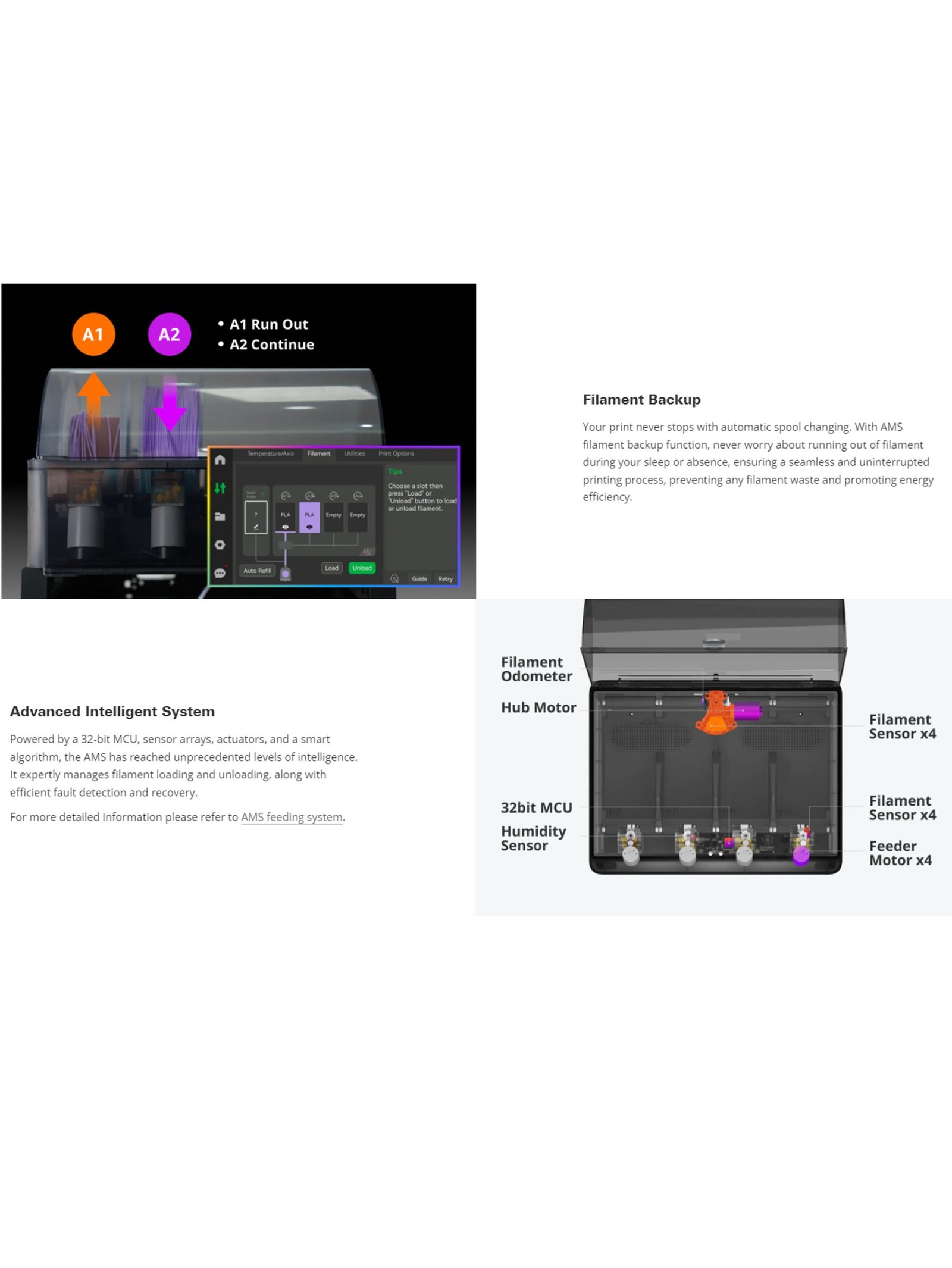 Powered by a 32-bit MCU, sensor arrays, actuators, and a smart algorithm, the AMS has reached unprecedented levels of intelligence. It expertly manages filament loading and unloading, along with efficient fault detection and recovery.
