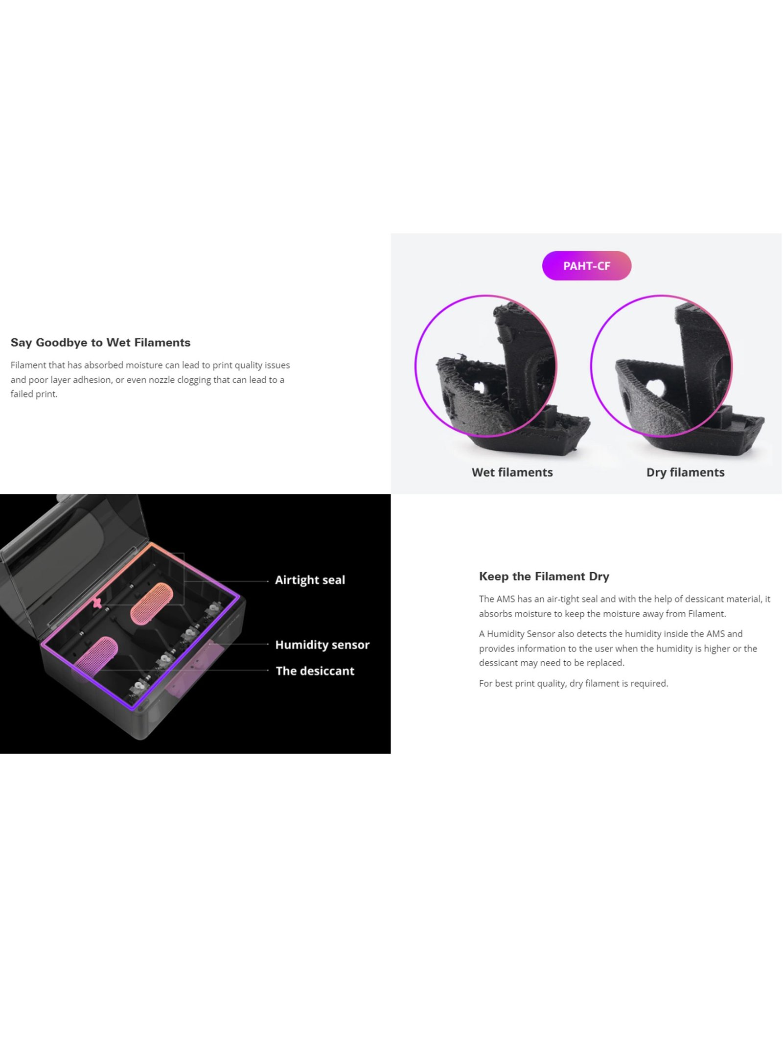 The AMS has an air-tight seal and with the help of dessicant material, it absorbs moisture to keep the moisture away from Filament.